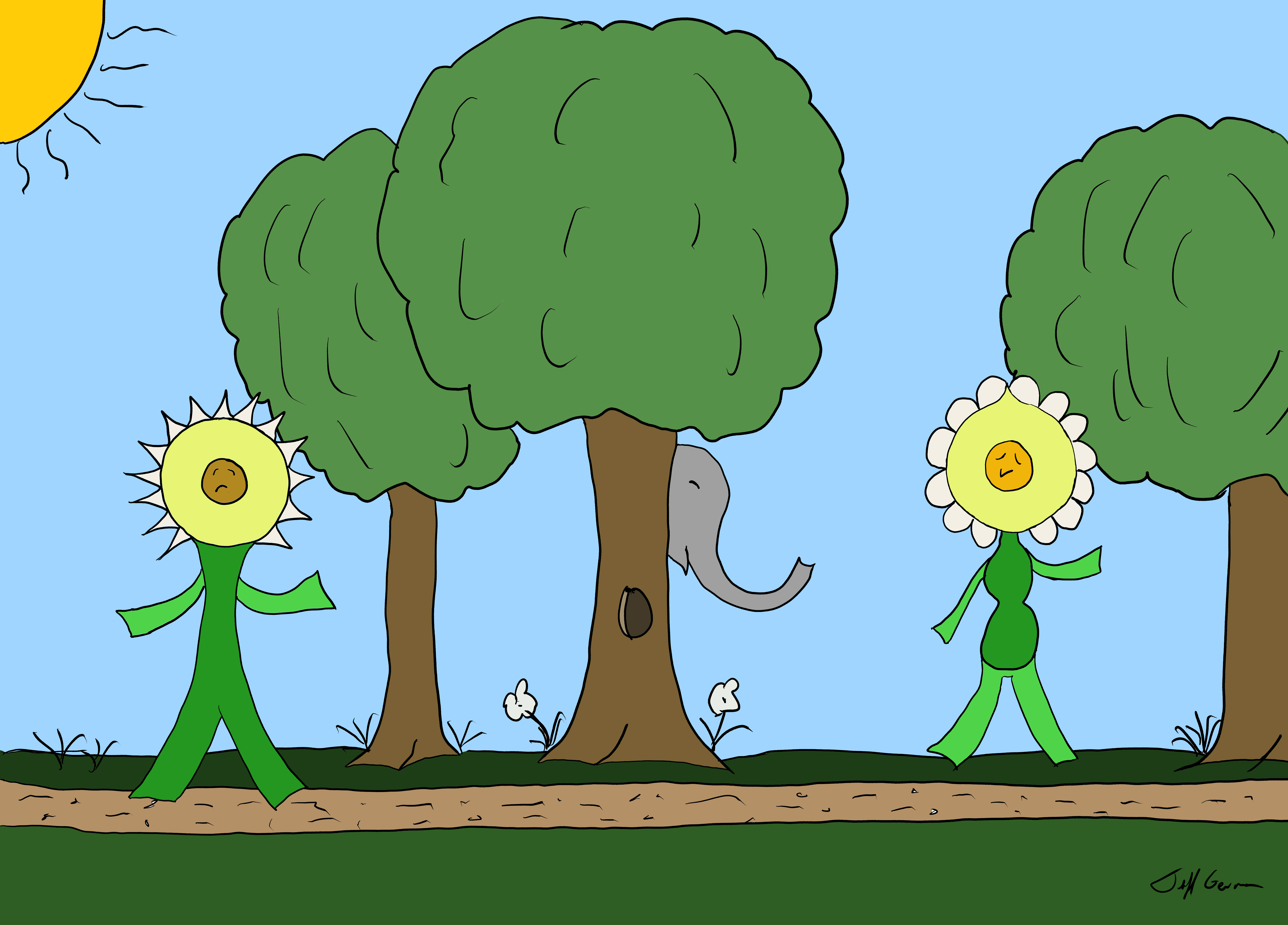 Disco suppresses a giggle. “How about we hike for a little bit longer?” she asks, reassuringly. “If we run into an elephant, I’ll ask her why she’s so far from home. Maybe she has a good story to tell us.” Patting his arm, she adds, “You like good stories, Doodles.”